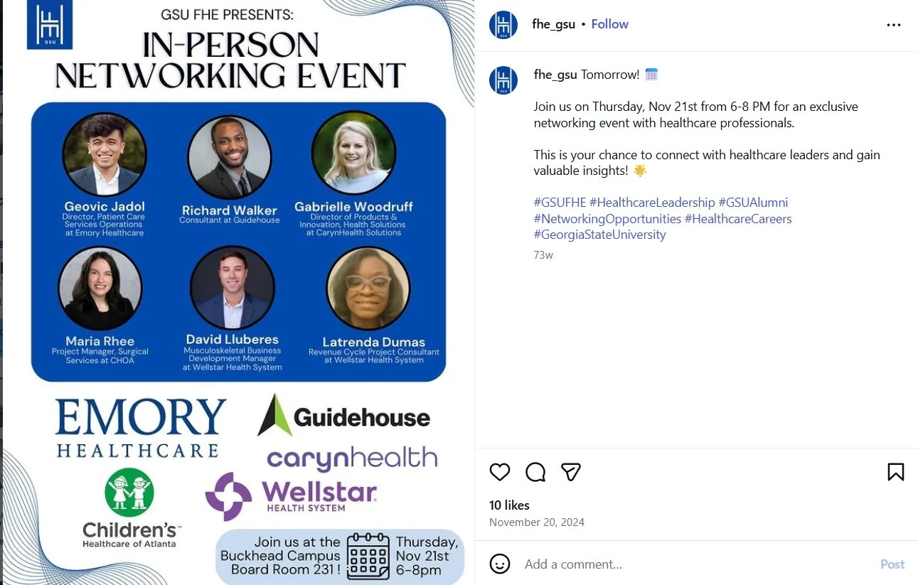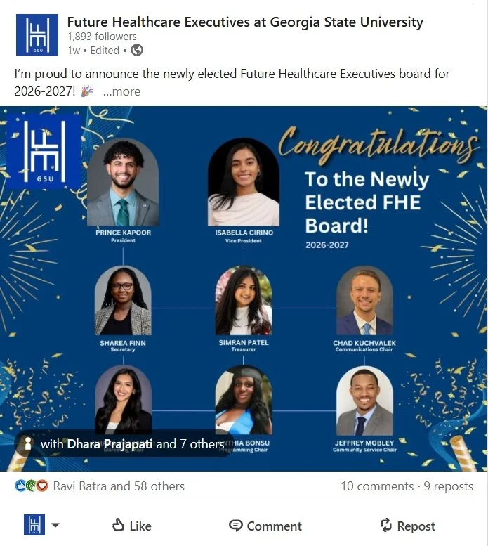 I had the amazing opportunity to be a part of the Future Health Executives of Georgia State University marketing team. There were a couple of networking events throughout the semester and moments where I highlighted members of the organization and their internships or life after the degree.